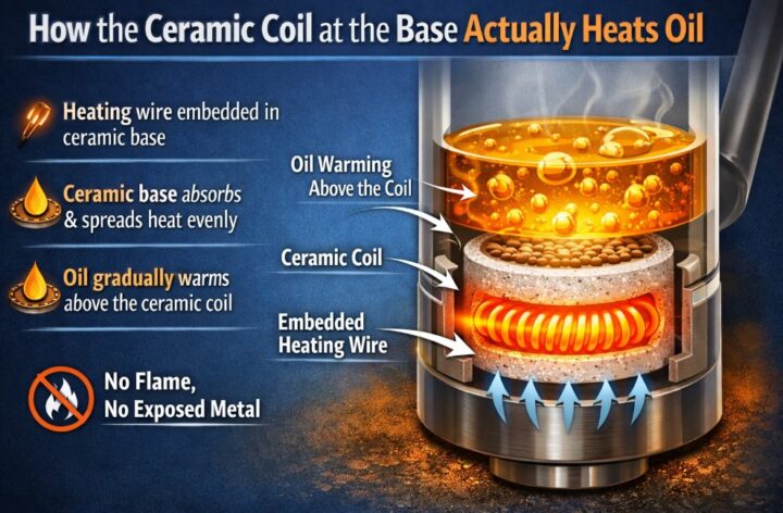 This controlled interaction between heat and oil is what allows ceramic base coils to deliver consistent performance even with thicker concentrates.