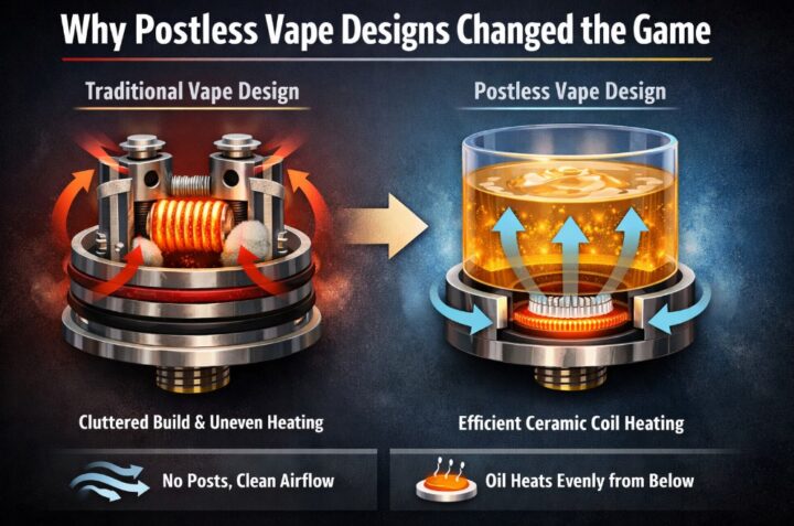 Modern postless vapes streamline airflow, reduce internal clutter, and allow ceramic coils to function more efficiently.